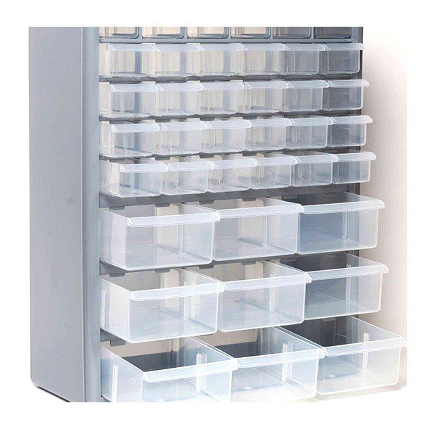 GABINETE GRIS ALMACENA EN 39 CAJONESLargo 47 cm Ancho 37.8 cm Material Plástico Color Gris y Transparente Acabado Mate Modelo DS-39 No. de piezas 1 Accesorios 39 Cajones