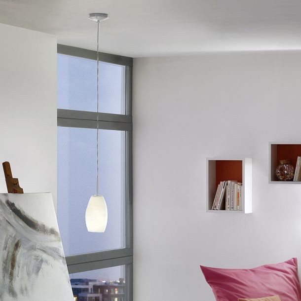 Colgante de vidrio con acentos en cromo, color translúcido. Base de metal, pantalla vidrio soplado. Foco recomendado: 40W (no incluido). Medidas: caída máxima 150cm, pantalla diámetro 30cm. Modelo DXC69. 1 año de garantía.