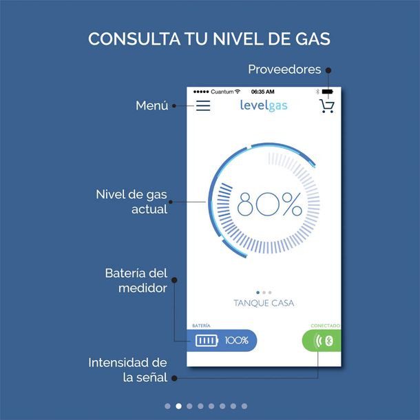 Levelgas es un medidor inalámbrico de gas para tanque estacionario. El sensor requiere dos baterías AA no incluidas y es de fácil instalación. Sólo tienes que colocarlo arriba del medidor de tu tanque de gas. Descarga la aplicación gratuita desde el App Store o Google Play para ver el nivel actual de gas de tu tanque en tu teléfono.