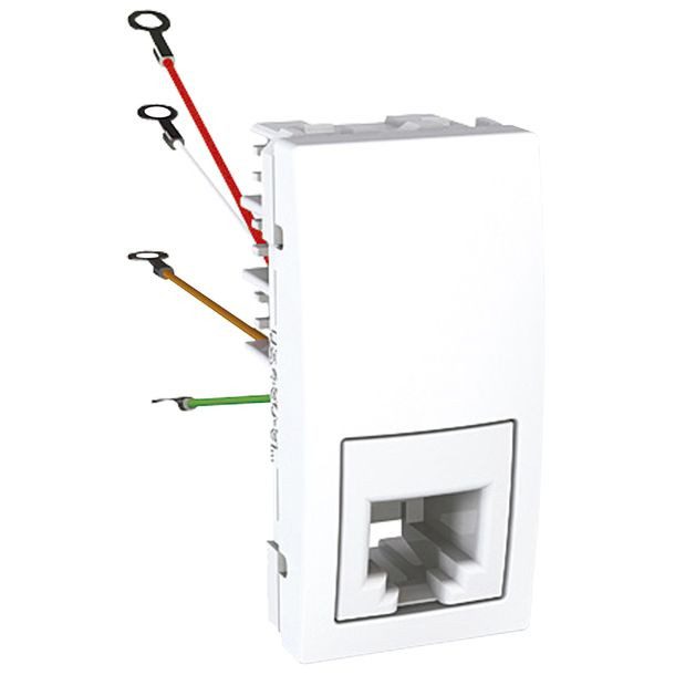 Toma telefónica RJ11. Color blanco. Plástico (ABS auto extinguible). Medidas 2.2 cm alto x 4.6 cm ancho x 2.7 cm fondo. Uso: residencial y comercial ligero. Garantía 18 meses. Modelo MU3.490.18-HD.